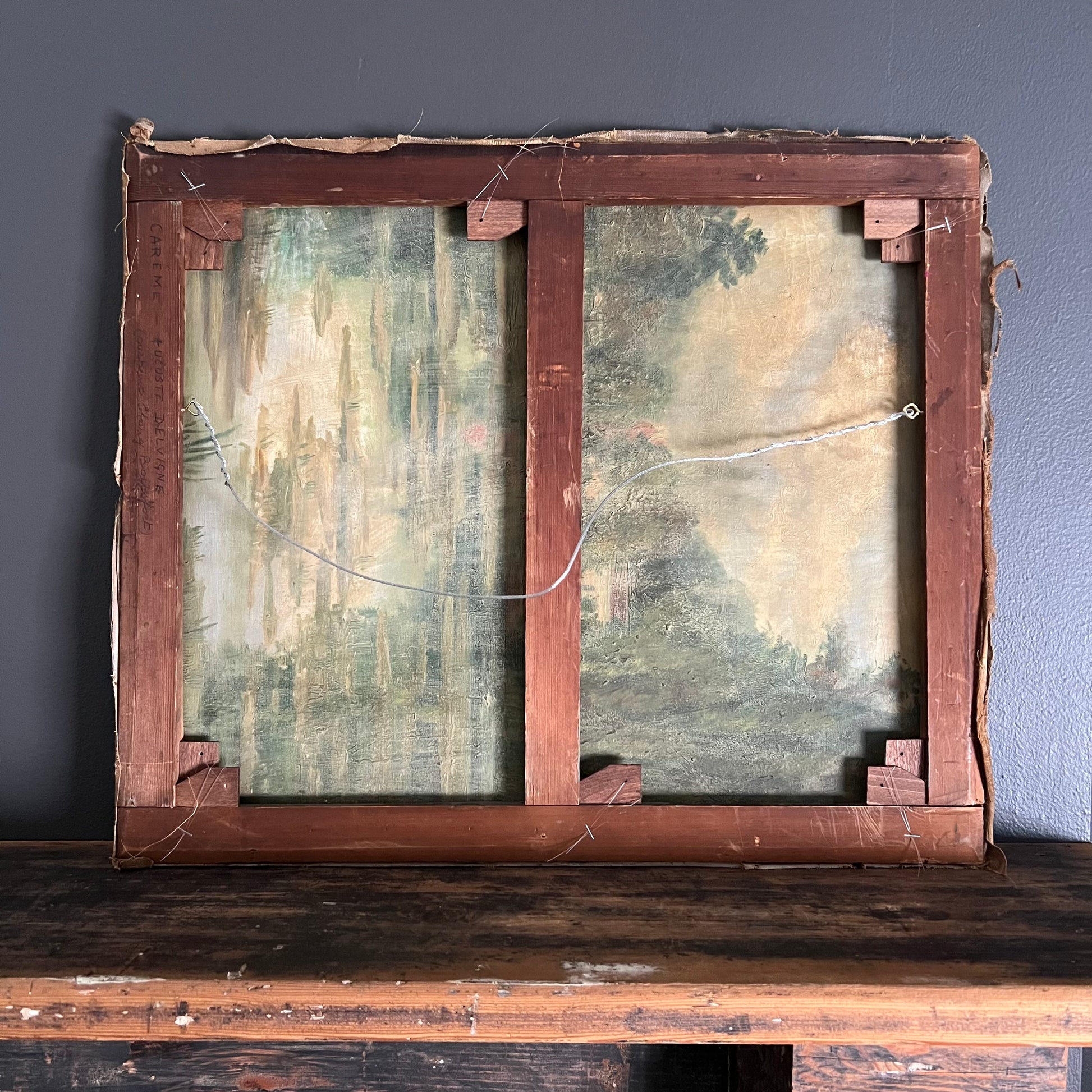 An unfinished landscape painting is on the reverse