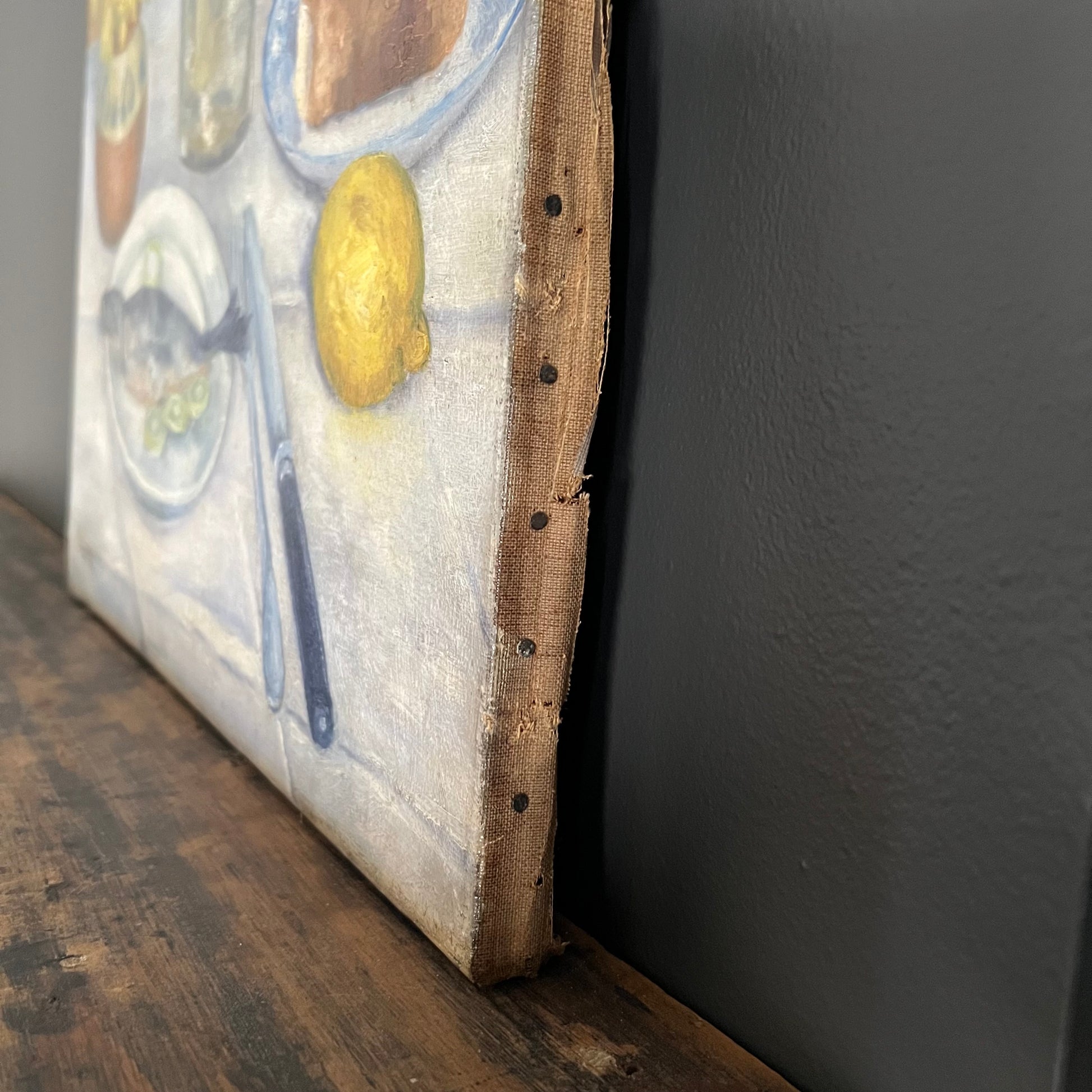 The painting surface is clean and in good condition for an antique piece. There is a lot charm to the edges of the canvas~ this piece really shows all of its wonderful years in the patina and fraying of the canvas. The edges are not perfectly cut in a straight line so if you are partial to a little rustic character this is for you. Whilst there are some lose threads it is secured very well to the stretcher. Quite possibly framed at some stage with a slight shade variation close to the edges along with some small losses and rubbing. Fabulous addition to a kitchen or restaurant wall!