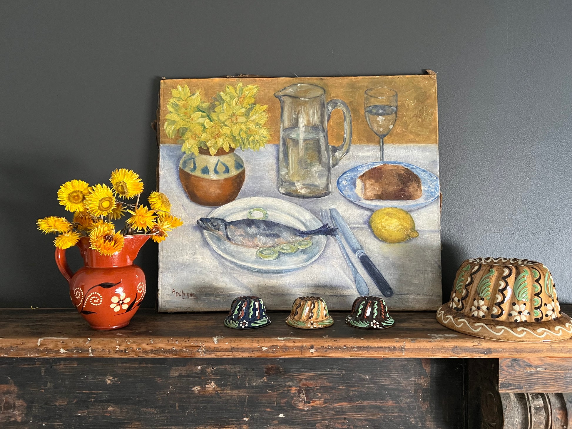 A fabulous antique still life painting featuring a simple dinner~ whole fish on a plate, lemon, water jug, loaf of bread and of course cheery yellow flowers in a pottery vase