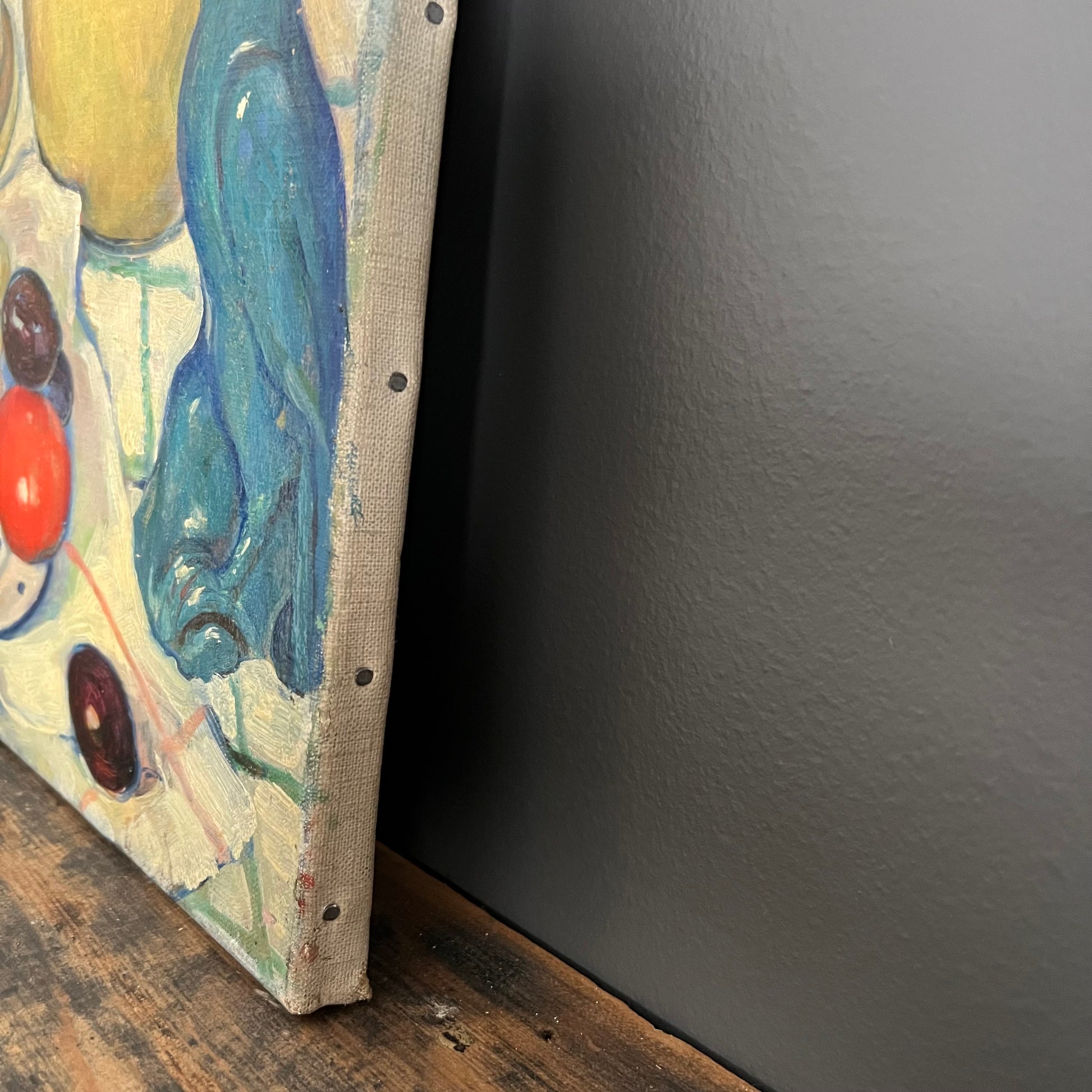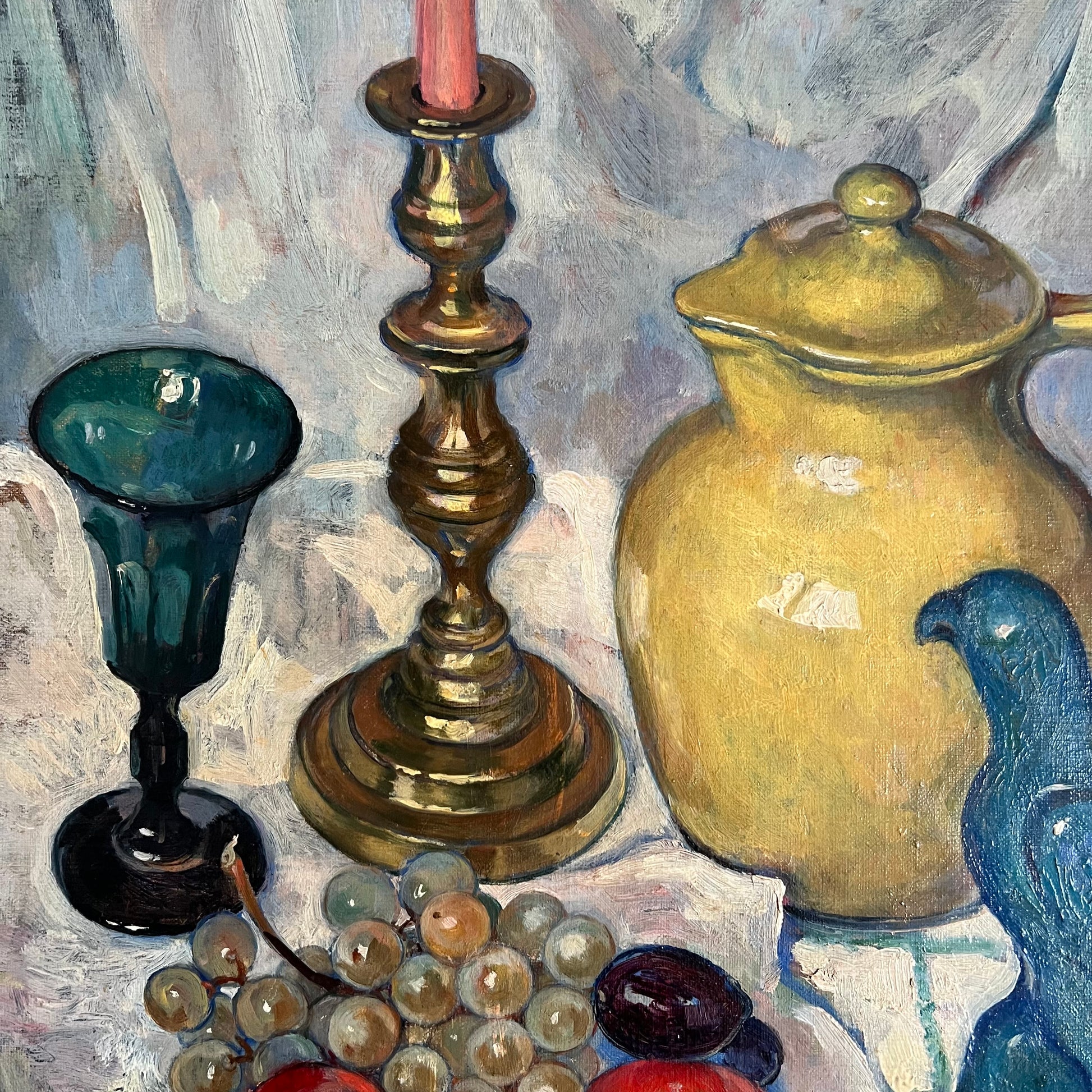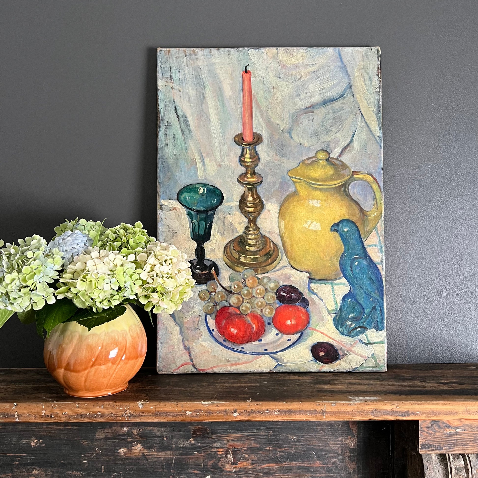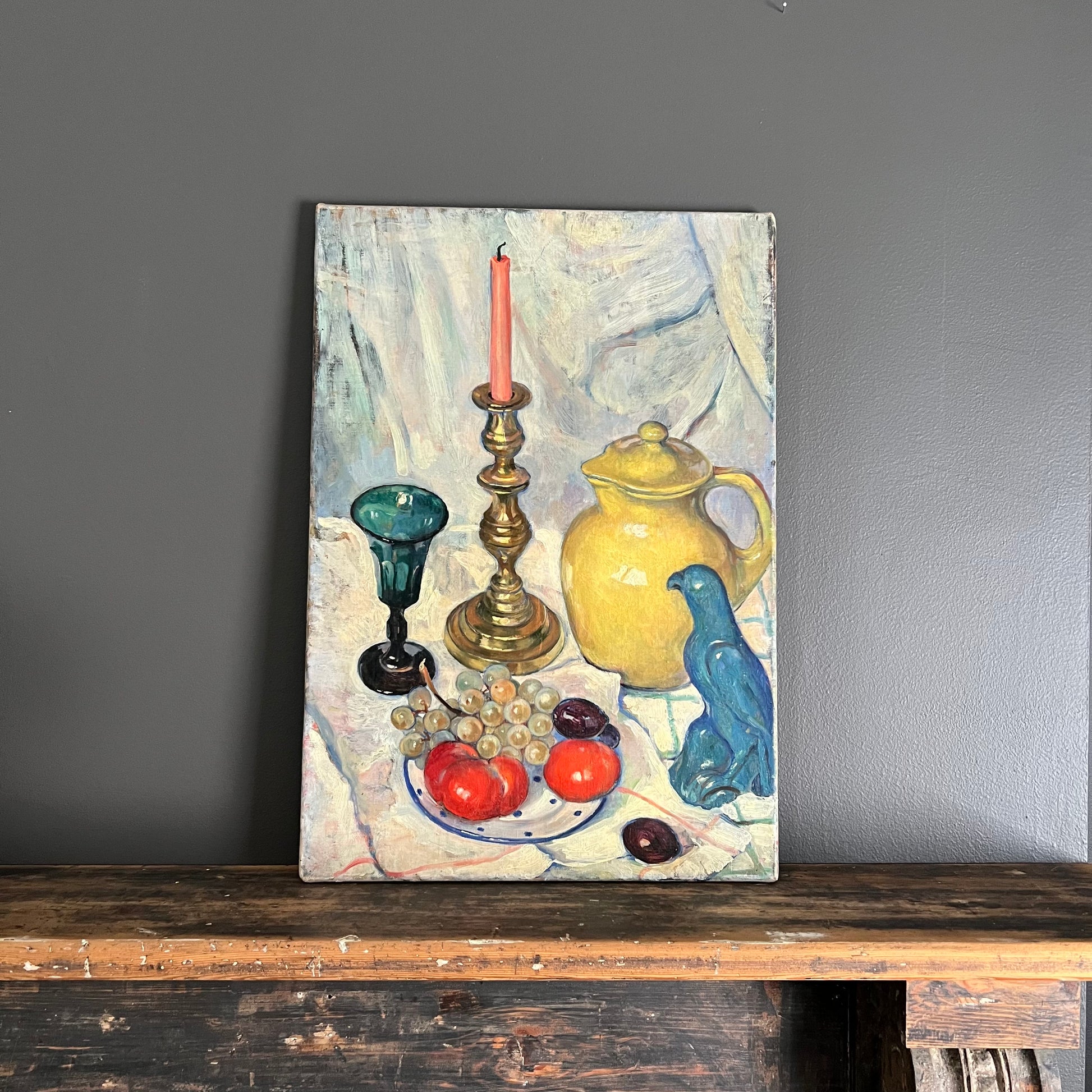 Vintage Painting Still Life Candlestick, Glass and Tomato