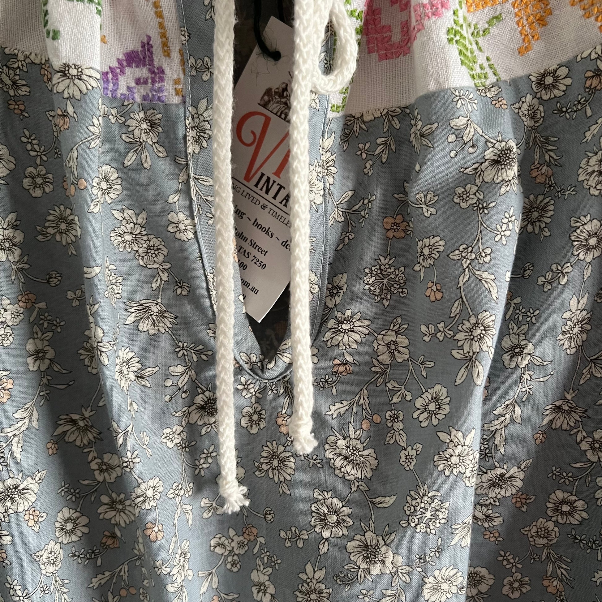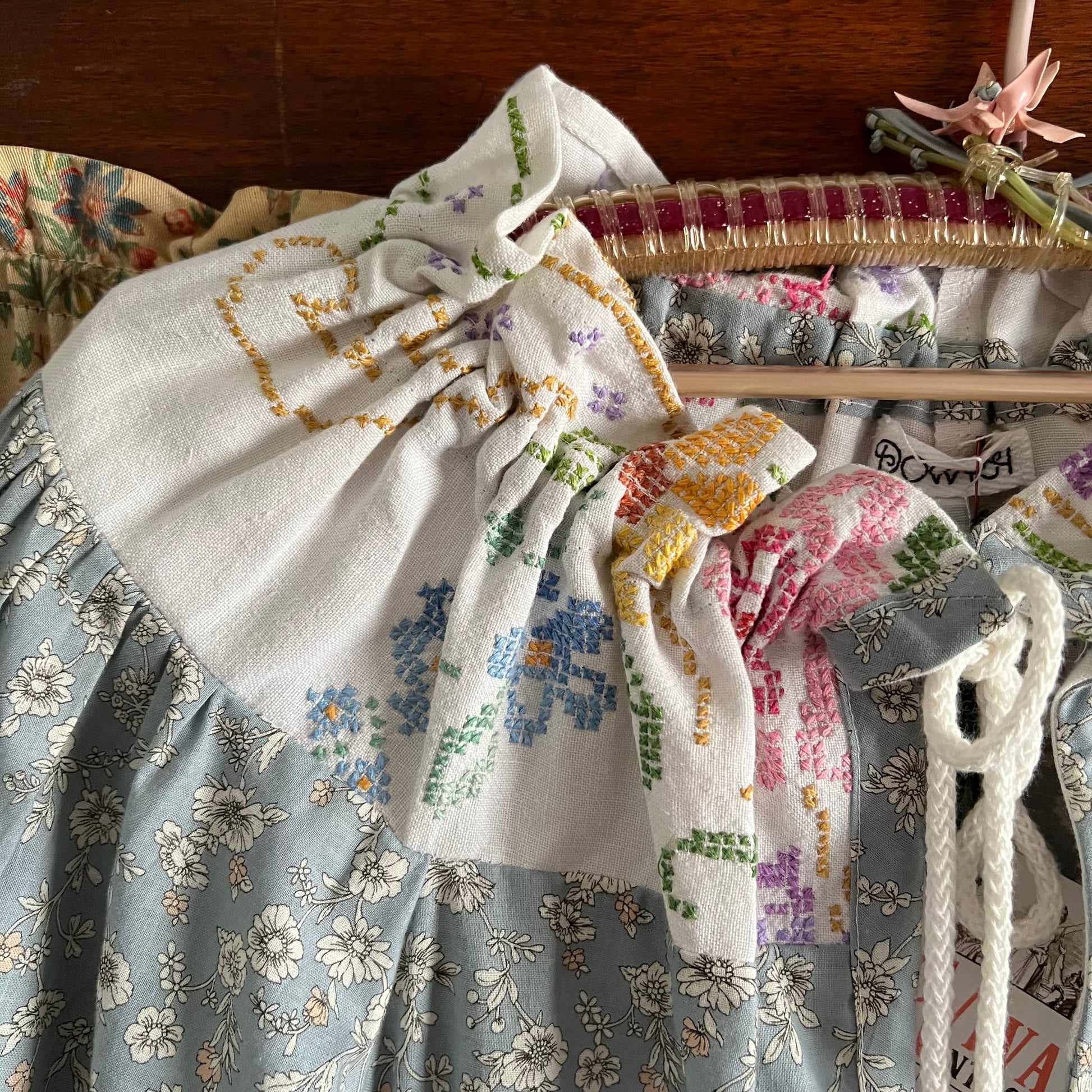 Hand embroidered linen panel reclaimed from a vintage tablecloth forms the neckline