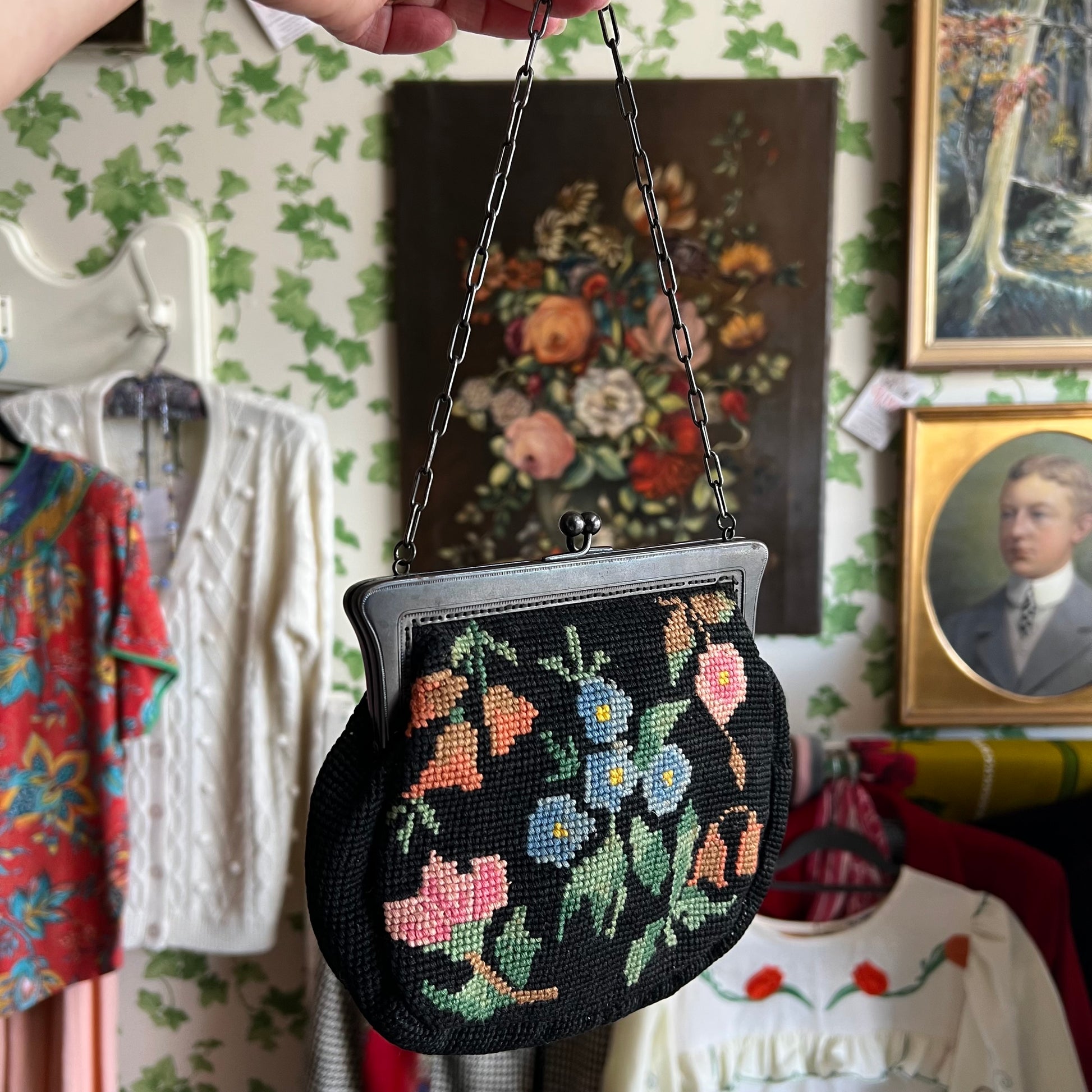 Vintage Floral Needlepoint Tapestry Small Handbag