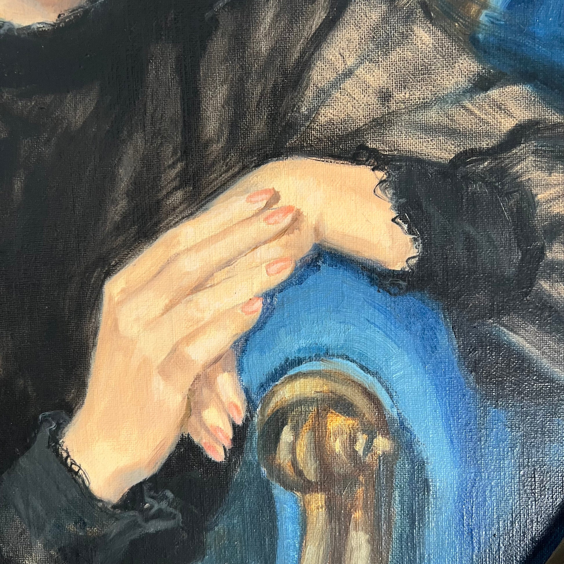 A striking portrait of a blonde woman in a black chiffon blouse seated in an ornate armchair with blue upholstery